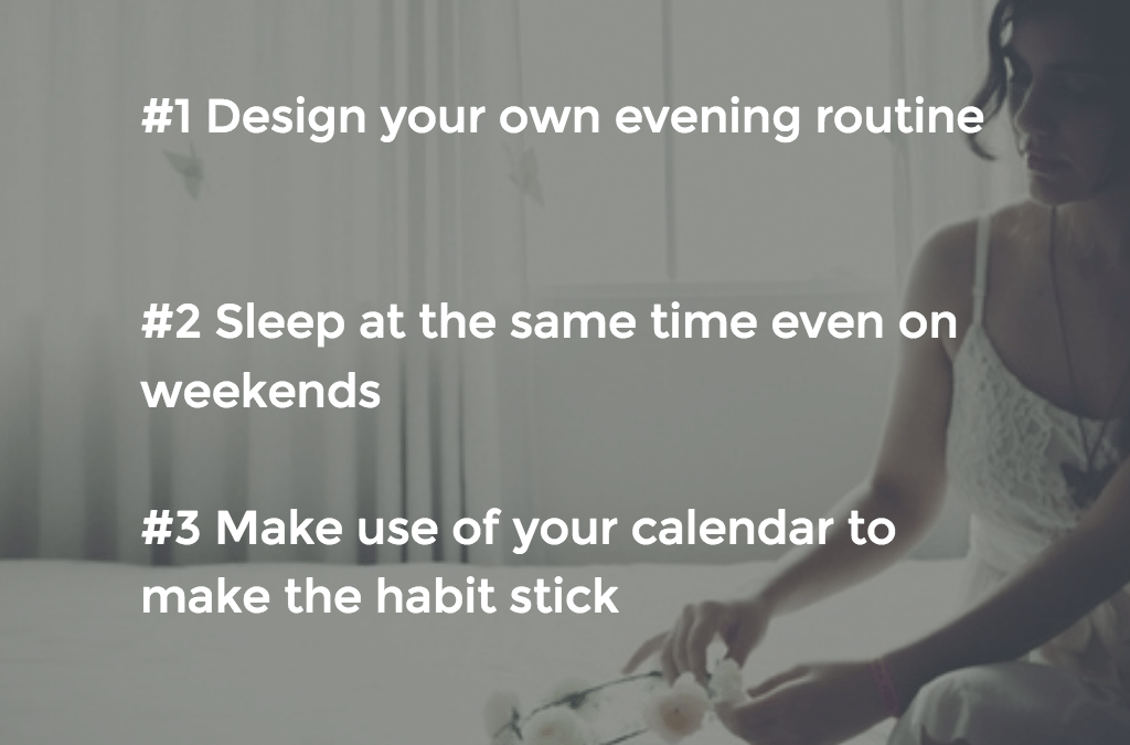 An evening routine is a series of tasks right before you go to bed. The benefit is that the more you do it, the more your body will get used to going to sleep after doing these things which will make it easier to pass out when you know you need to.